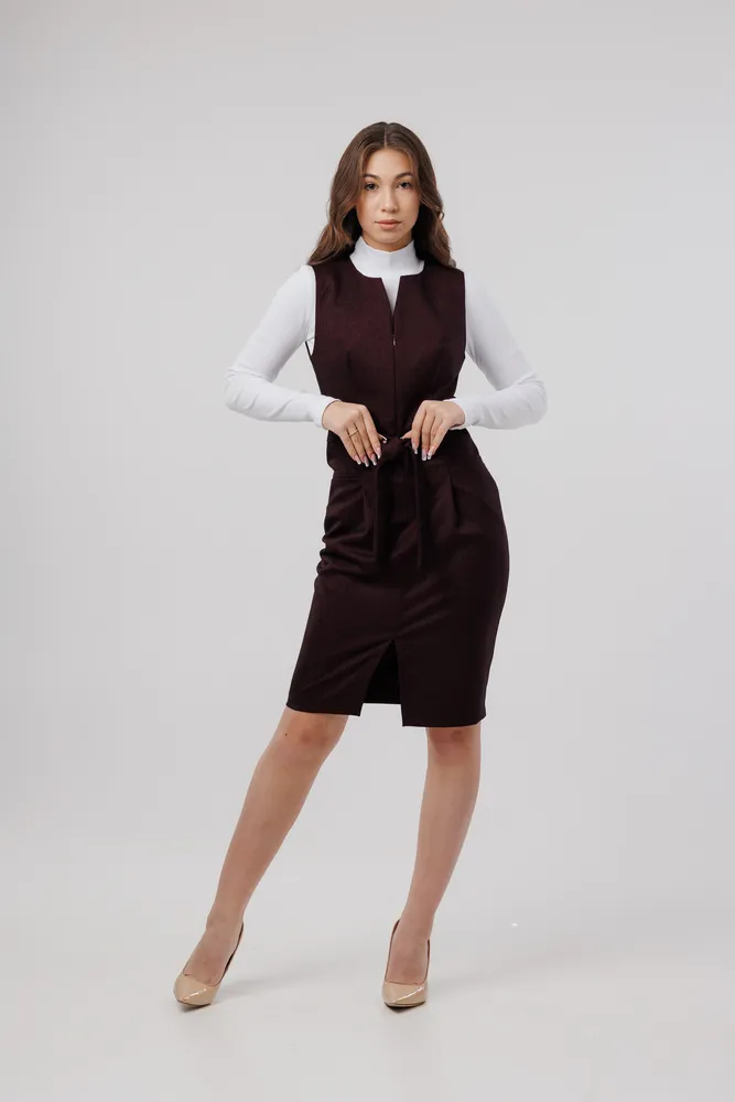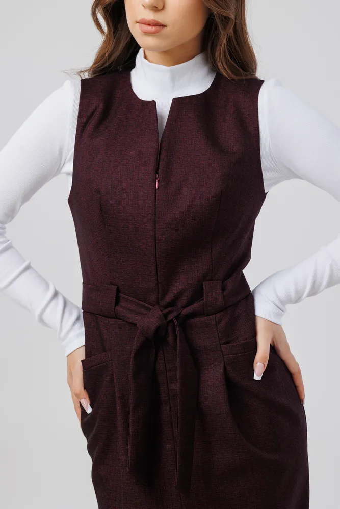 Сарафан отлично подойдет для работы в офисе, школе . Также этот женский сарафан в сочетании с нарядной блузкой можно надеть в кафе, встречу с друзьями т.д. Сарафан прекрасно сидит по фигуре, не стесняет движений. Застёжка расположена спереди на потайную молнию . Присутствует пояс , которым можно подчеркивать фигуру. Круглый вырез горловины. Отделка рельефным швом с потайными карманами. Сарафан без подкладки, рекомендуется использовать как второй слой одежды.