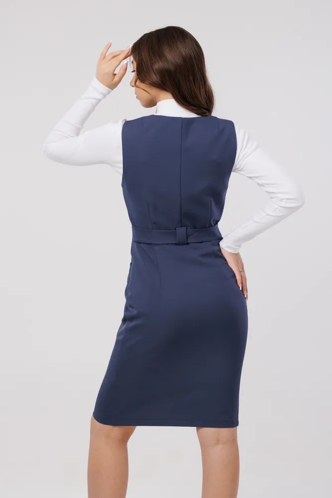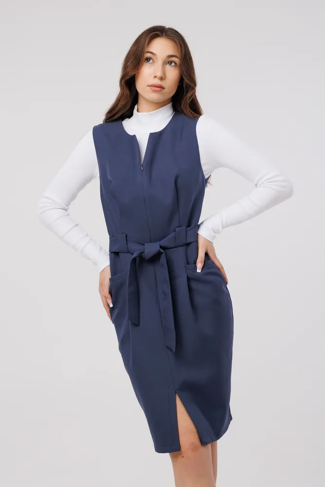 Сарафан отлично подойдет для работы в офисе, школе . Также этот женский сарафан в сочетании с нарядной блузкой можно надеть в кафе, встречу с друзьями т.д. Сарафан прекрасно сидит по фигуре, не стесняет движений. Застёжка расположена спереди на потайную молнию . Присутствует пояс , которым можно подчеркивать фигуру. Круглый вырез горловины. Отделка рельефным швом с потайными карманами. Сарафан без подкладки, рекомендуется использовать как второй слой одежды.