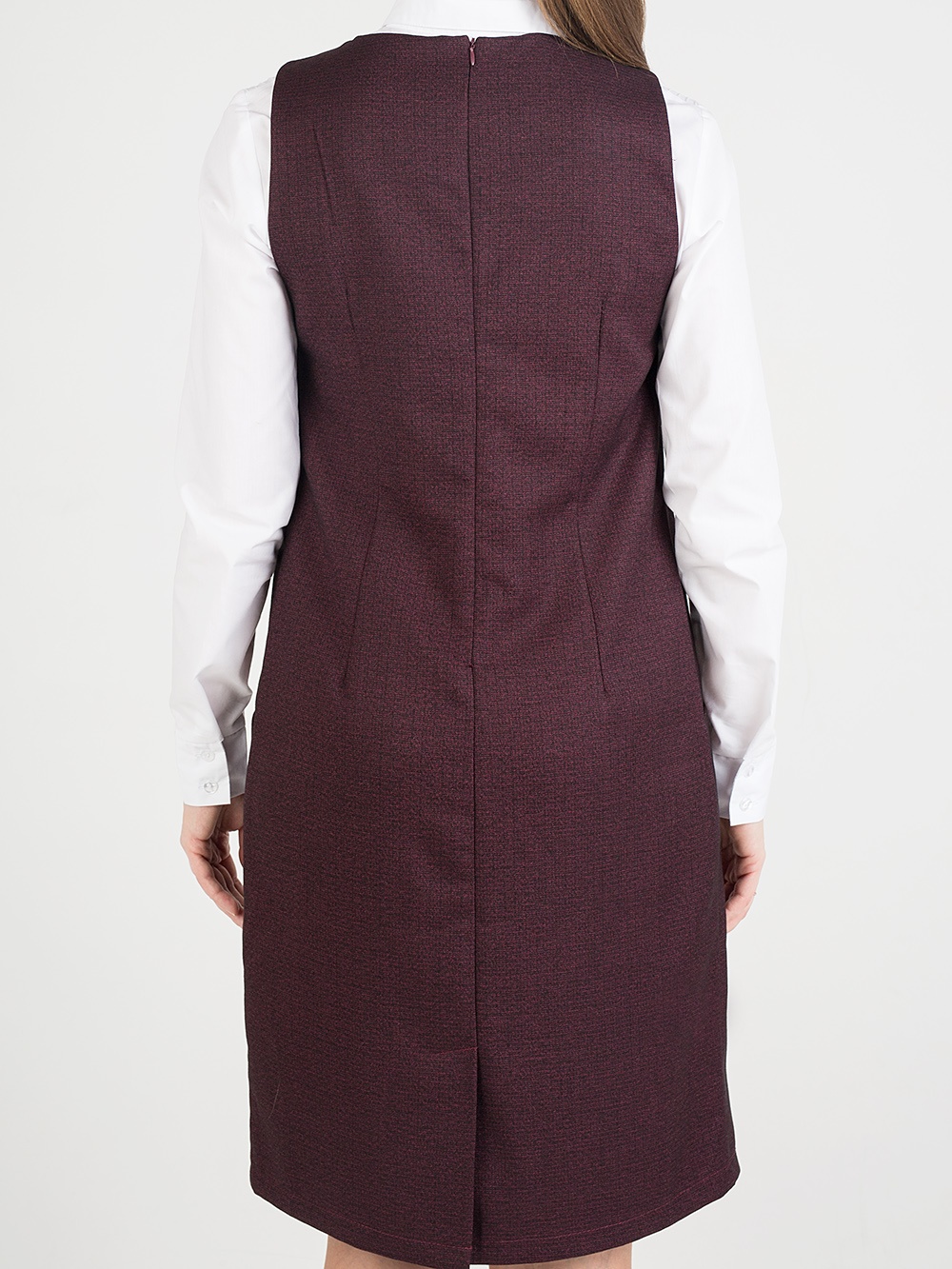 Женский сарафан прямого силуэта. Сарафан отлично подойдет для работы в офисе, школе и т.д. Также этот женский сарафан в сочетании с нарядной блузкой можно надеть в кафе, встречу с друзьями т.д. Сарафан прекрасно сидит по фигуре, не стесняет движений. Застёжка расположена сзади по среднему шву на потайную молнию. Круглый вырез горловины. Отделка рельефным швом с потайными карманами. Сарафан без подкладки, рекомендуется использовать как второй слой одежды.