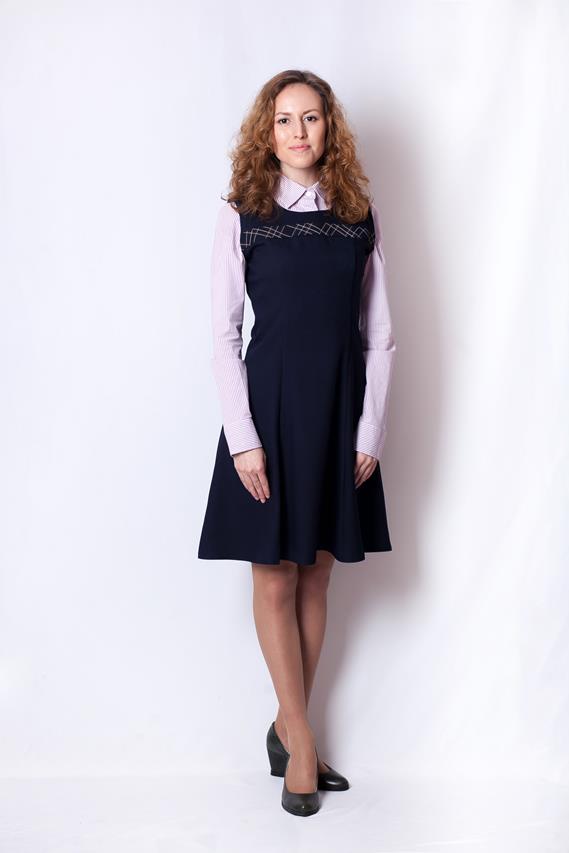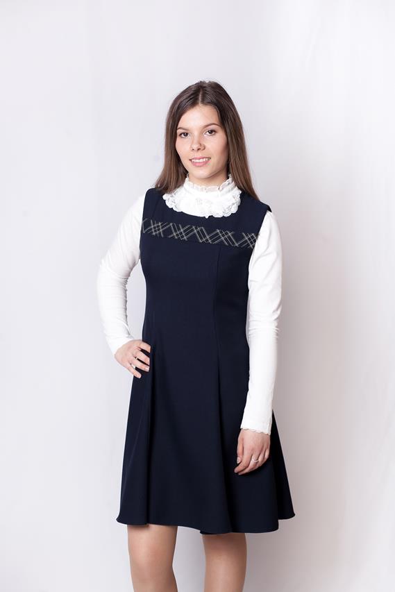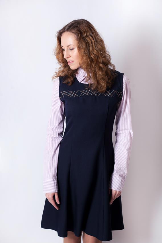 Сарафан годе полуприлегающего силуэта. На полочке кокетка из отделочной ткани (в клетку).