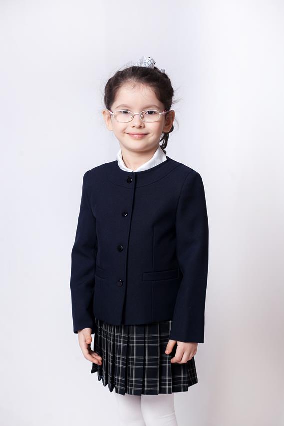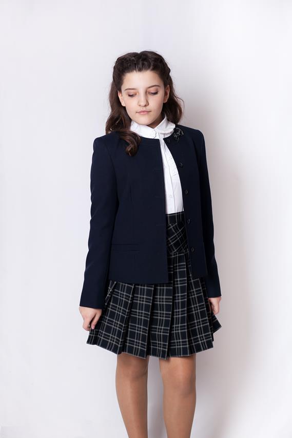 Жакет для девочки полуприлегающего силуэта. Центральная застежка на 5 пуговиц. На полочках прорезные карманы в листочку.