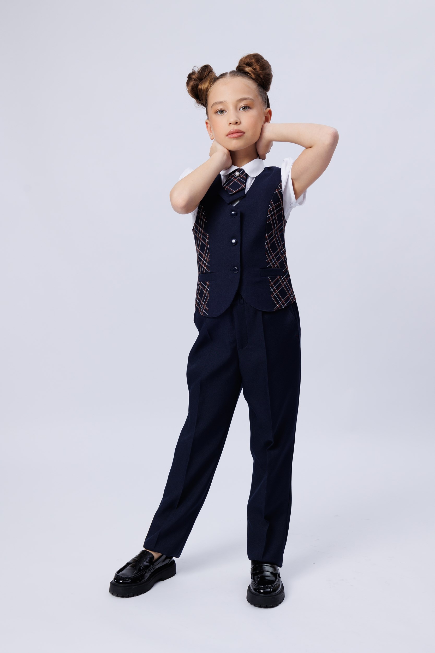 Жилет с бочком для девочки полуприлегающего силуэта, с прорезными карманами в листочку. На спинке по линии талии расположен хлястик. Центральная застежка на 4 пуговицы. Бочок из отделочной ткани (в клетку).