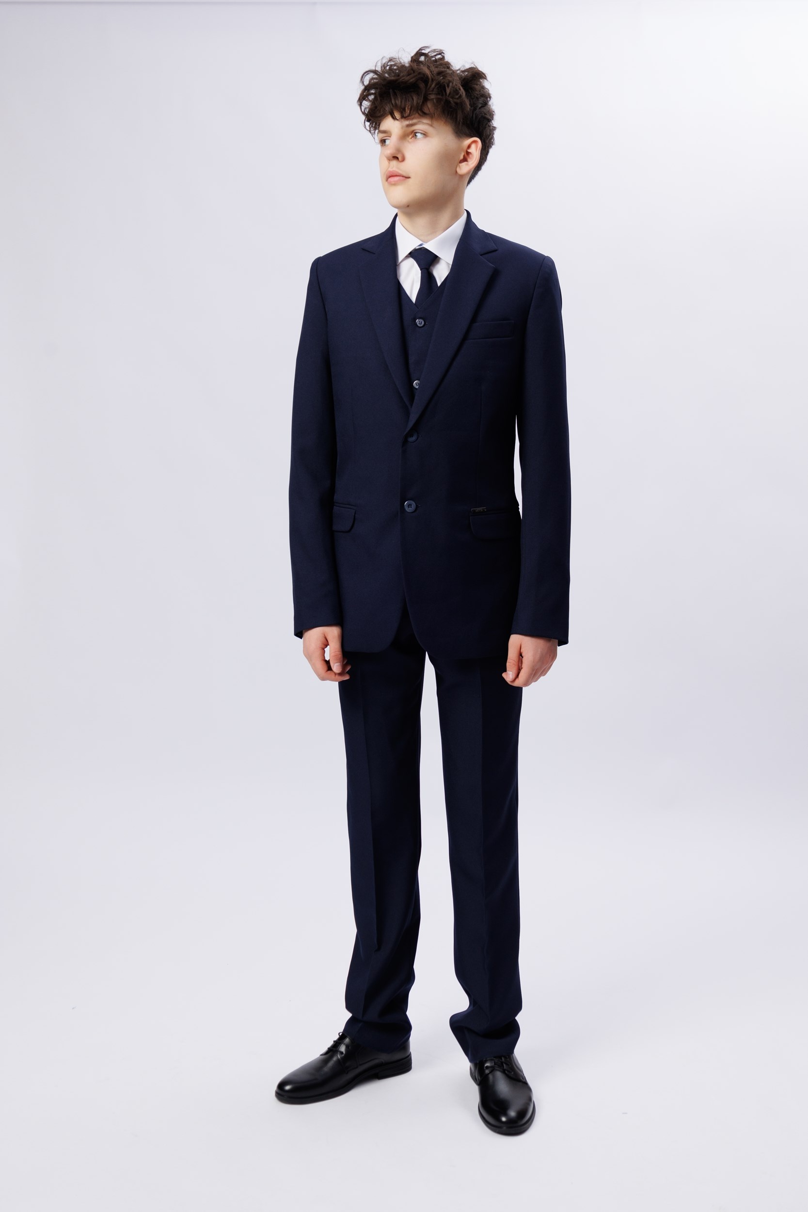 Пиджак для мальчика полуприлегающего силуэта, однобортный. Центральная застежка на две пуговицы. На полочках два кармана с клапанами.