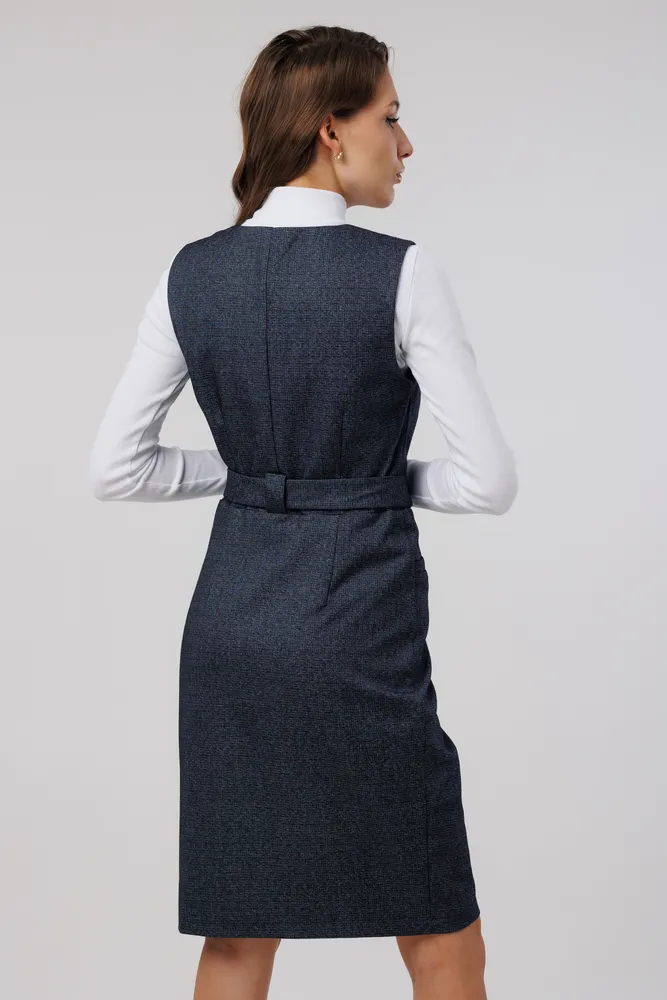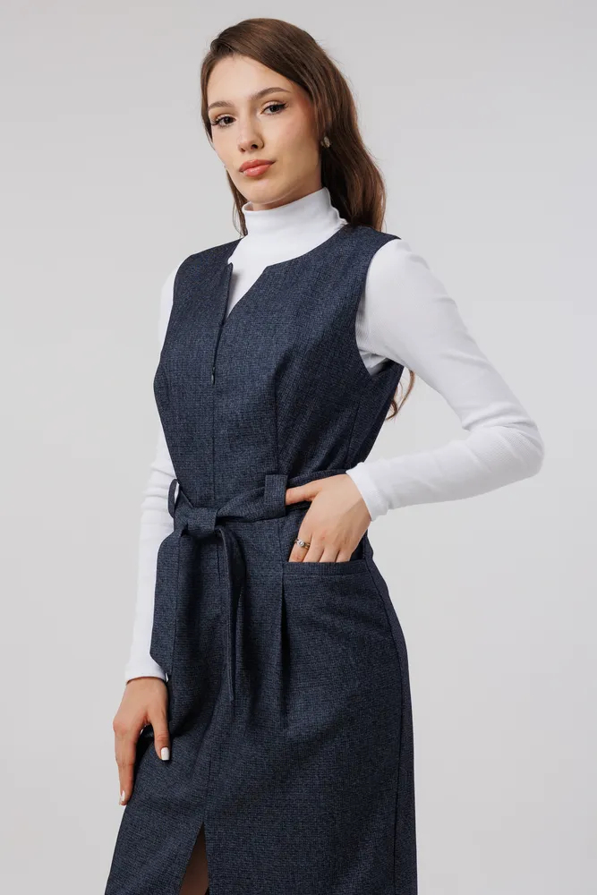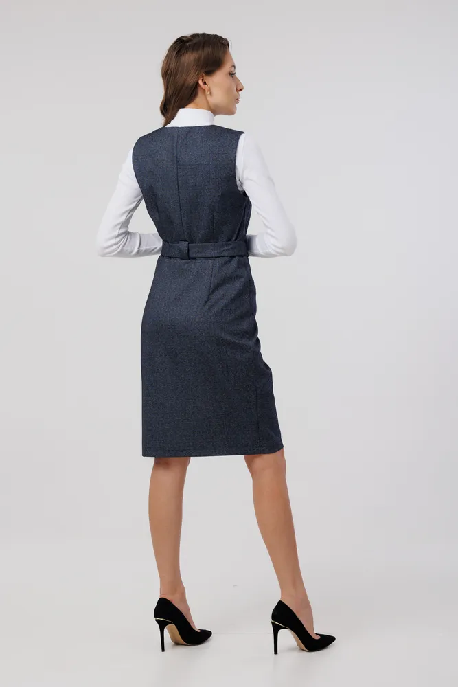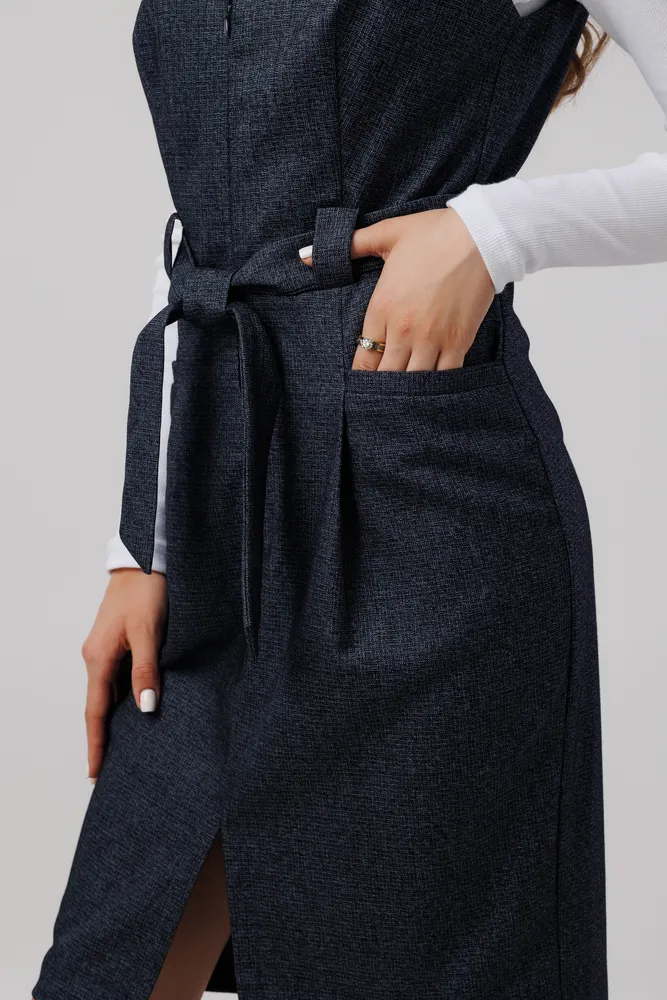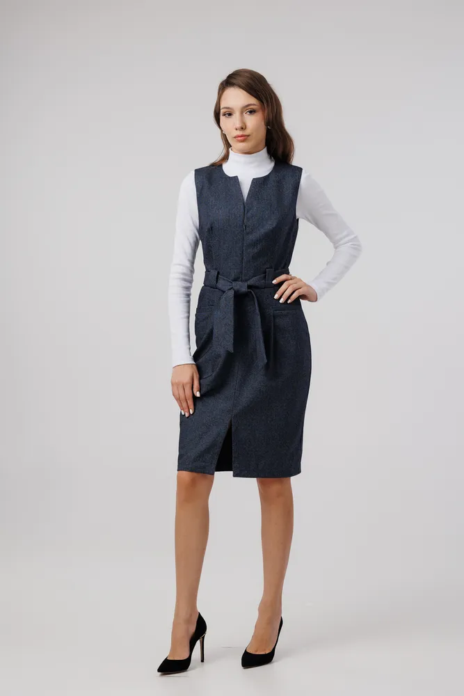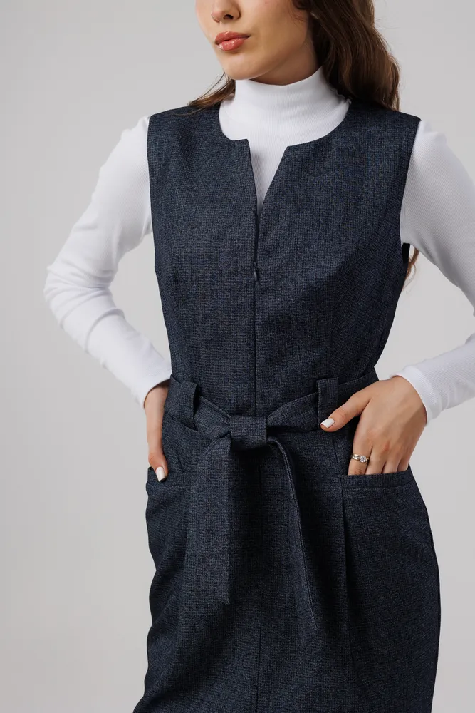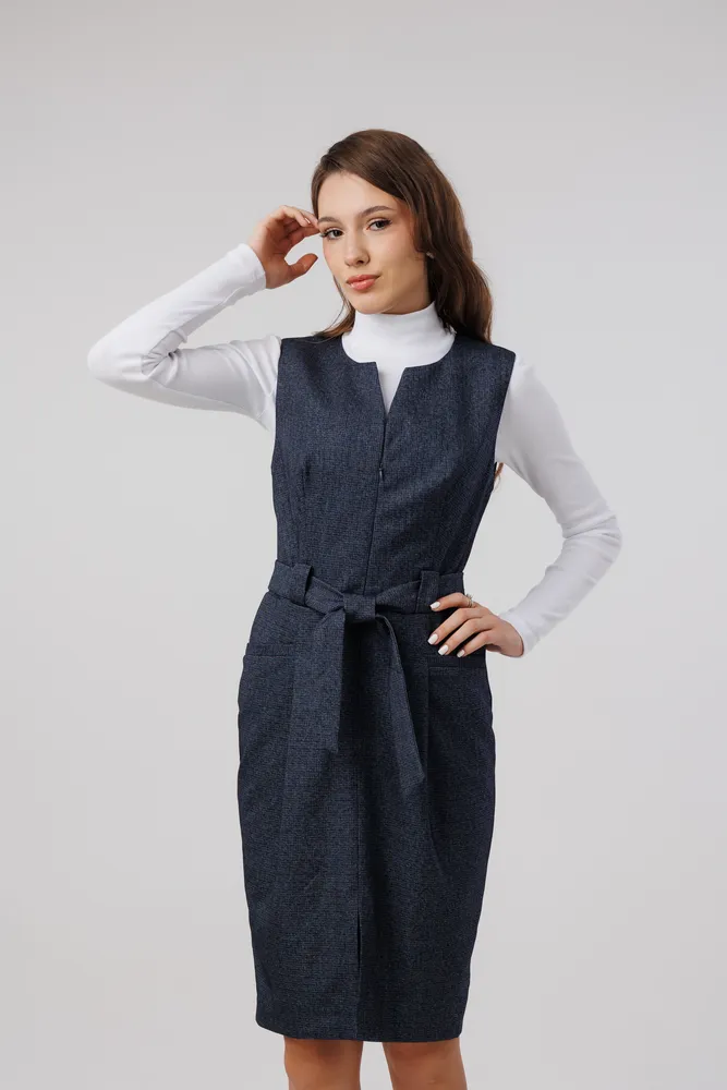 Сарафан отлично подойдет для работы в офисе, школе . Также этот женский сарафан в сочетании с нарядной блузкой можно надеть в кафе, встречу с друзьями т.д. Сарафан прекрасно сидит по фигуре, не стесняет движений. Застёжка расположена спереди на потайную молнию . Присутствует пояс , которым можно подчеркивать фигуру. Круглый вырез горловины. Отделка рельефным швом с потайными карманами. Сарафан без подкладки, рекомендуется использовать как второй слой одежды.