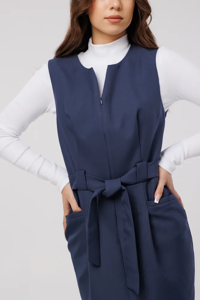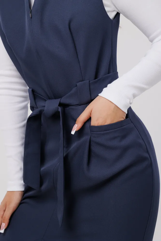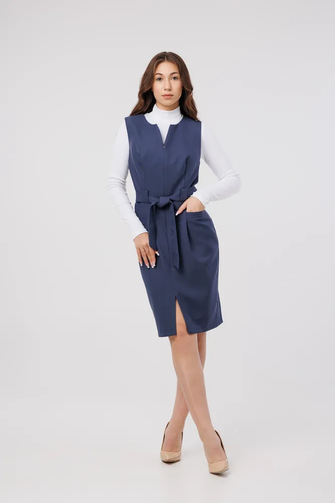 Сарафан отлично подойдет для работы в офисе, школе . Также этот женский сарафан в сочетании с нарядной блузкой можно надеть в кафе, встречу с друзьями т.д. Сарафан прекрасно сидит по фигуре, не стесняет движений. Застёжка расположена спереди на потайную молнию . Присутствует пояс , которым можно подчеркивать фигуру. Круглый вырез горловины. Отделка рельефным швом с потайными карманами. Сарафан без подкладки, рекомендуется использовать как второй слой одежды.