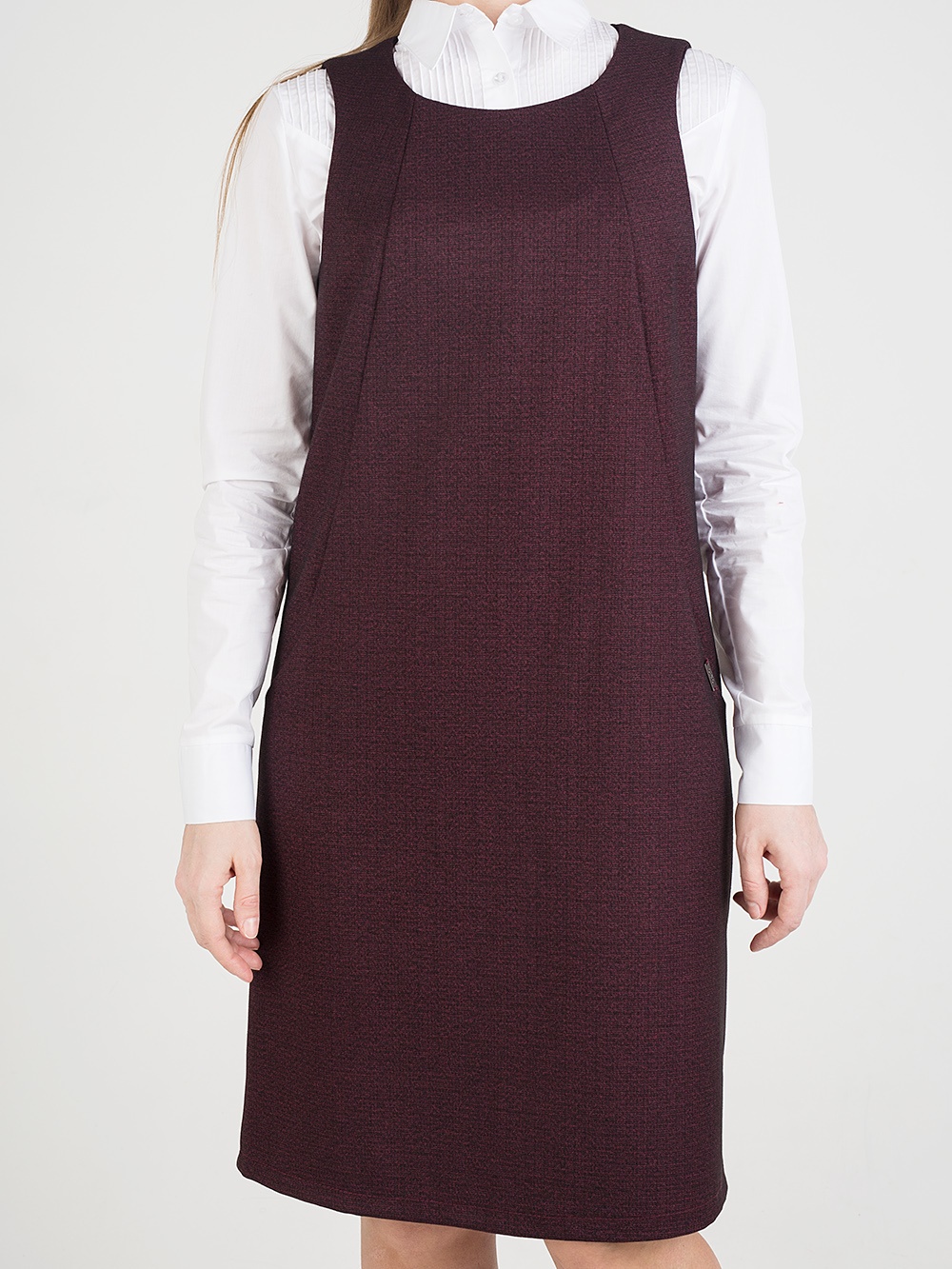 Женский сарафан прямого силуэта. Сарафан отлично подойдет для работы в офисе, школе и т.д. Также этот женский сарафан в сочетании с нарядной блузкой можно надеть в кафе, встречу с друзьями т.д. Сарафан прекрасно сидит по фигуре, не стесняет движений. Застёжка расположена сзади по среднему шву на потайную молнию. Круглый вырез горловины. Отделка рельефным швом с потайными карманами. Сарафан без подкладки, рекомендуется использовать как второй слой одежды.