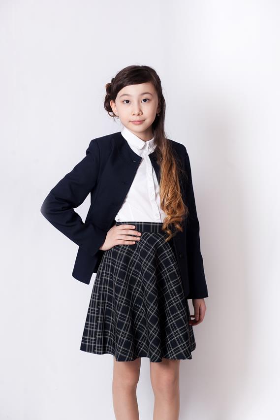 Жакет для девочки полуприлегающего силуэта. Центральная застежка на 5 пуговиц. На полочках прорезные карманы в листочку.