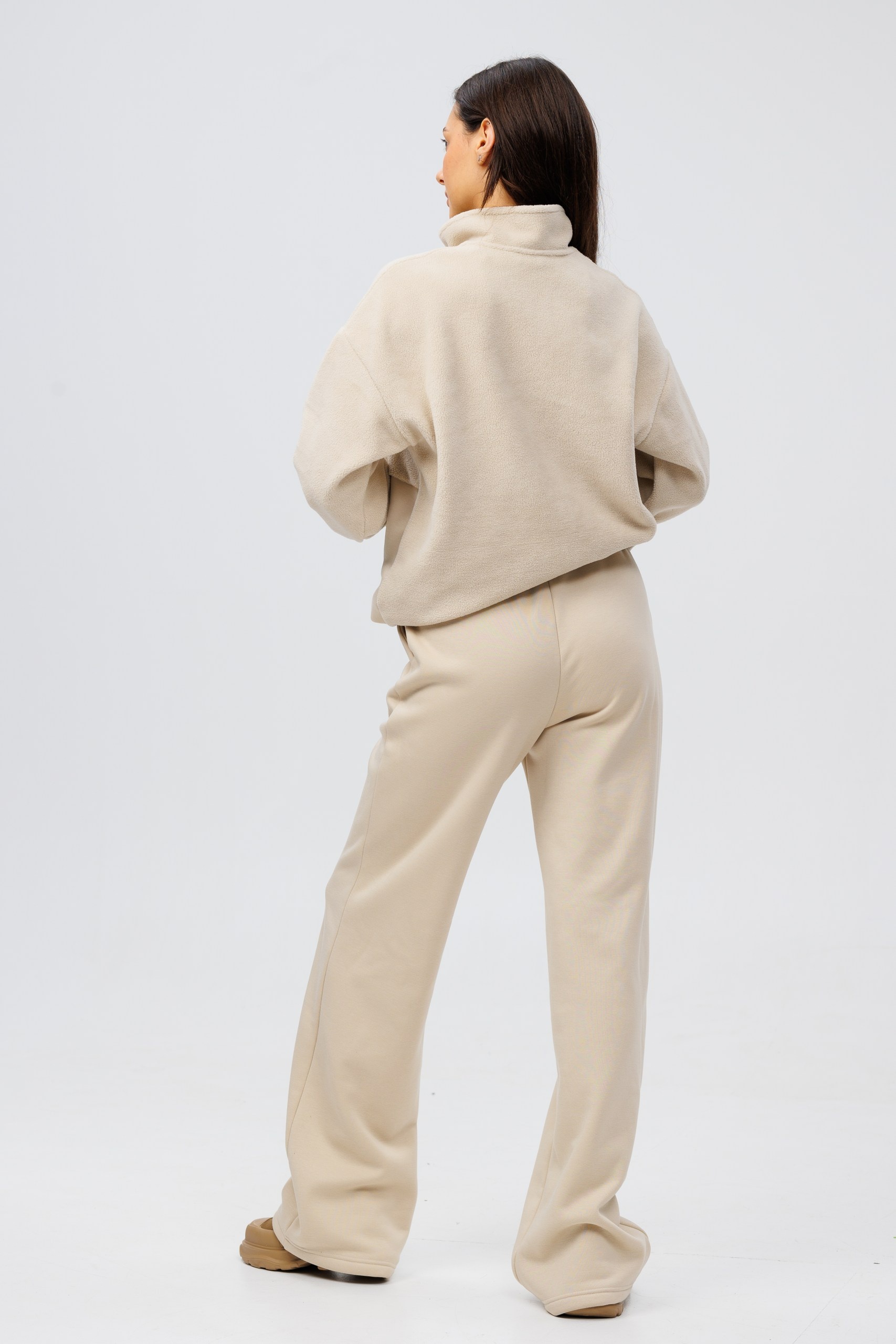 Теплый костюм с начесом для девочки - свитшот и брюки палаццо - отличный выбор для активного отдыха и зимних прогулок. Главное преимущество костюма для девочки в том, что начес выполнен по инновационным технологиям. Его называют «барашек» или «тедди». Начес со временем не теряет форму, плотность и внешний вид. А главное, не лезет, не скатывается и НЕ ОСТАВЛЯЕТ ВОРС НА ОДЕЖДЕ! Благодаря флису Тедди, костюм для девочки тёплый, мягкий, нежный, как одноименная мягкая игрушка. Он безумно приятен к телу, при этом, хорошо держит форму. Футер так же называют «барашком» из-за интересной изнанки, похожей на настоящую овечью шерсть. У футера Тедди гладкая хлопковая лицевая сторона. Он не закатывается с обеих сторон, а значит будет радовать вас долгое время. Костюм с начесом комбинированный, оснащен регулировочной резинкой по низу кофты и карманом-кенгуру с верхним клапаном-обманкой. Брюки имеют карманы в боковых швах и отстроченные стрелки, что добавляет женскому теплому костюму изысканного шарма.